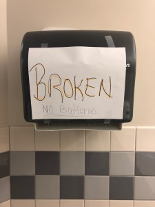 I laughed out loud (immediately wondering if the stalls were empty), and (silently this time) thanked this inanimate object for its touch of empathy. That’s right, bathroom towel dispenser: we’re both a bit broken today. And we are definitely out of batteries.